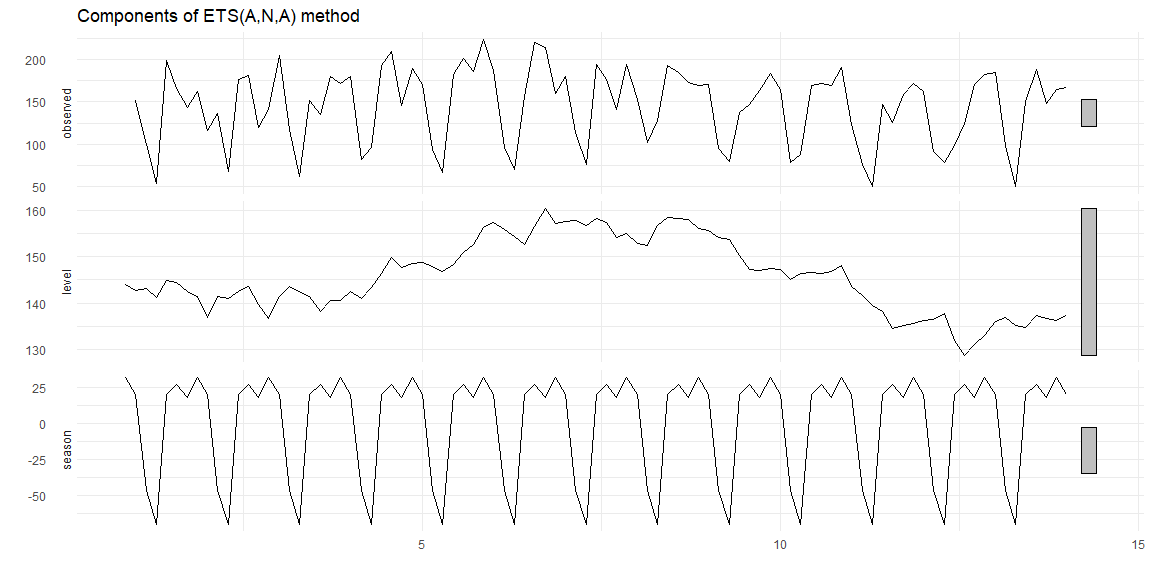 Estimating the \(\alpha, \beta\) and \(\gamma\) parameters by minimizing the sum of squared errors, we get that the additive error type, No trend and additive seasonality.