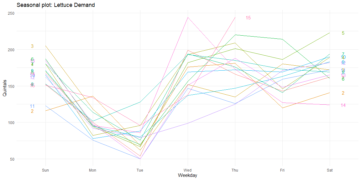 We can visualise this seasonality using seasonal plots. From these plots, we can see that the demand for Lettuce is the least on Tuesday while highest on Wednesdays. Thus, a clear weekly seasonality in the data can be observed in the data.